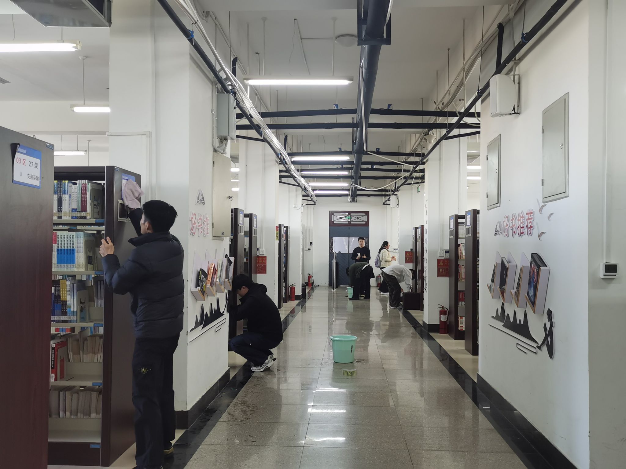 活动前期,图书馆与两个学院党总支深度对接、精准谋划,共同制定详实实施方案,为志愿服务筑牢保障。学院通过广泛宣传动员,明确职责分工、凝聚行动合力;志愿者们在图书馆统筹安排下,奔赴各书库与阅览区,手持清洁工具对桌椅表面、书架缝隙、地面角落等进行全方位清扫,不放过任何卫生死角,以踏实认真的态度展现青年担当。劳动过程中,图书馆馆员与志愿者并肩作战,一边参与清洁工作,一边耐心解答图书分类、借阅管理等相关疑问,现场互动频繁、氛围热烈有序。
