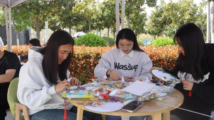 活动伊始,同学们选择自己喜欢的花材和团扇并领取制作工具,正式开始了自主制作流程,大家发挥自己的创意和想象力,在心中进行简单的扇面构图,对永生花进行修剪、拼接处理,然后一一粘贴点缀在空白团扇上,有的黄白相嵌,有的粉蓝相映……目睹团扇上次第绽放出的花,同学们把艺术融入扇中,在不同的扇面上展现自己独特的青春风采,定格春日里最美的花色。