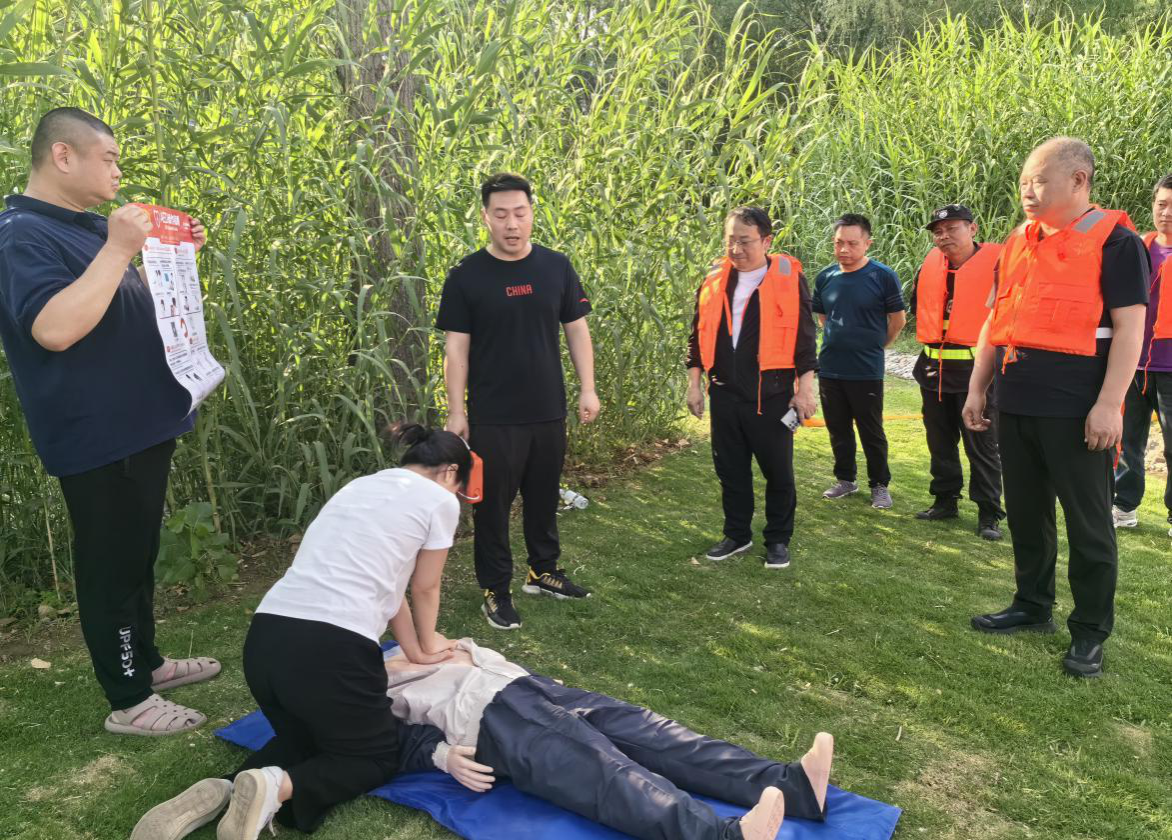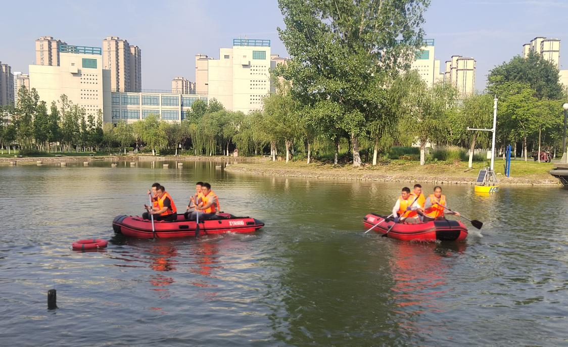 防汛应急演练分为水上救援、医疗急救和积水抽排三个部分,共调配了皮划艇、AED自动体外除颤仪、发电机、潜水泵、救生衣等救援应急物资。应急避险逃生演练分为消防知识培训、灭火器操作方法及避险逃生应急疏散演练三个环节。