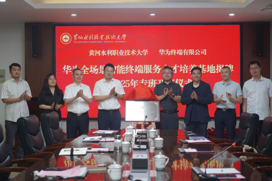 5月27日,黄河水利职业技术大学与华为终端有限公司共同举行华为全场景智能终端服务人才培养基地揭牌暨2025年专班开班仪式。黄河水利职业技术大学党委副书记、校长胡昊,副校长朱焕立,教务处和电气工程学院相关负责人,华为中国终端全屋智能交付与服务总监王铁柱、华为河南终端业务部服务总监赵俊、华为河南终端业务部全屋智能总监曾凤明等师生代表和企业代表出席仪式。仪式由电气工程学院院长王磊主持。