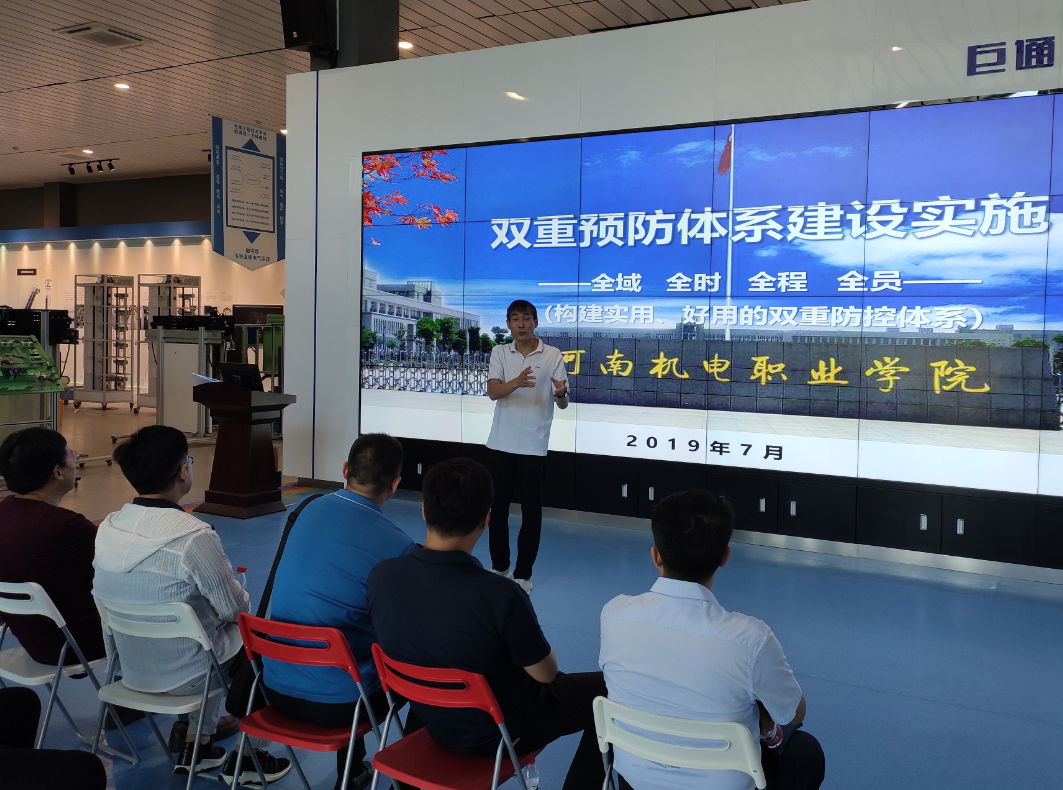为贯彻落实国务院安委办《实施遏制重特大事故工作指南构建双重预防机制的意见》、河南省教育厅《河南省教育系统学校安全风险辨识管控与隐患排查治理双重预防体系建设实施细则(试行)》的通知(豫教安全〔2019〕85 号)等文件要求,高质量按时完我校双重体系建设任务,提升学校现代化治理能力,2019年8月30日上午,由党政办公室、校保卫处、教务处、学生处、信息化管理办公室、后勤管理服务中心等六部门领导组成的调研小组赴河南机电职业学院就该校的双重预防体系建设情况进行座谈交流和实地考察学习。