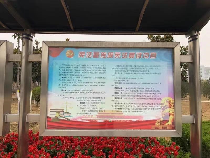 学校充分利用各种宣传手段,通过网络、新媒体、校园广播、宣传栏、悬挂横幅、板报、主题班会等形式,面向全校师生分阶段、分层次全方位开展宪法学习教育活动。学校各部门分别组织教职工开展宪法专题学习,积极营造学法、知法、守法、尊法、信法、用法的良好氛围。学校将法制教育有机融入到日常的教学中,纳入到全校学生的教学计划中。在学校明志广场举行了以“学宪法,知宪法”为主题的升国旗仪式和晨读活动。同时,积极组织学生参与教育部全国青少年普法网“宪法卫士”行动计划。截至目前,学校已完成答题人数19670人次,学生学习完成率100%。