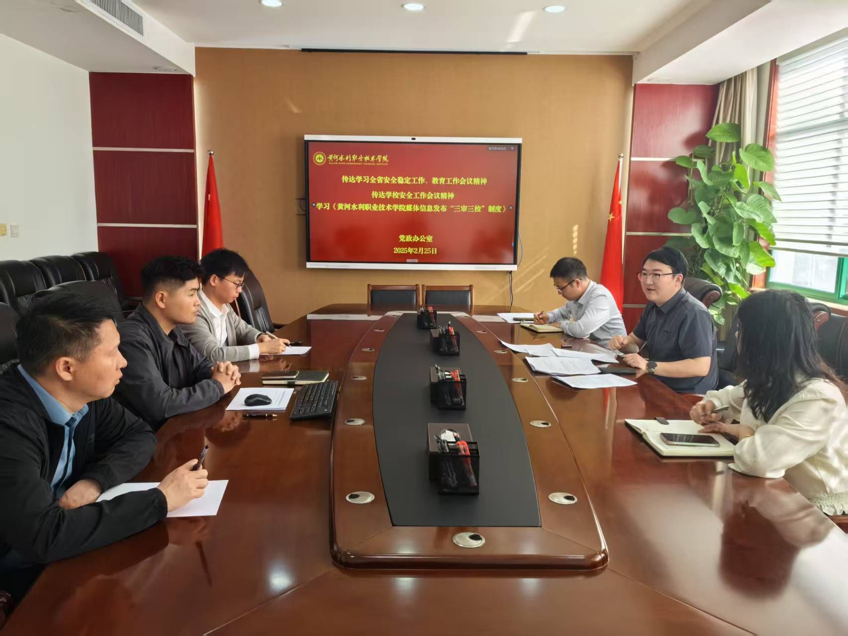 2025 年 2 月 25 日,党政办公室组织部门职工深入学习全省安全稳定工作、教育工作会议精神、学校安全工作会议精神,以及《黄河水利职业技术学院媒体信息发布“三审三校”制度》,会议由党政办公室主任李聪主持。