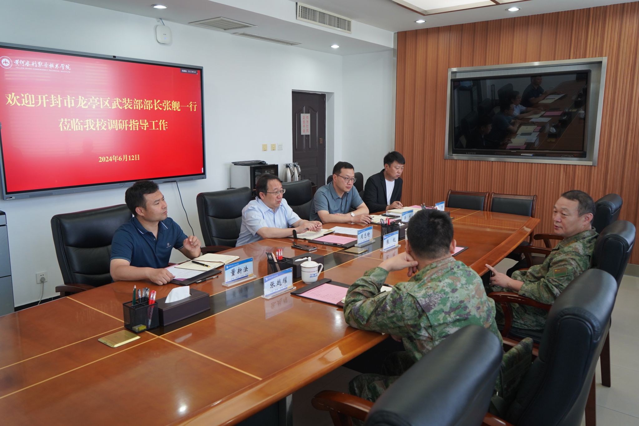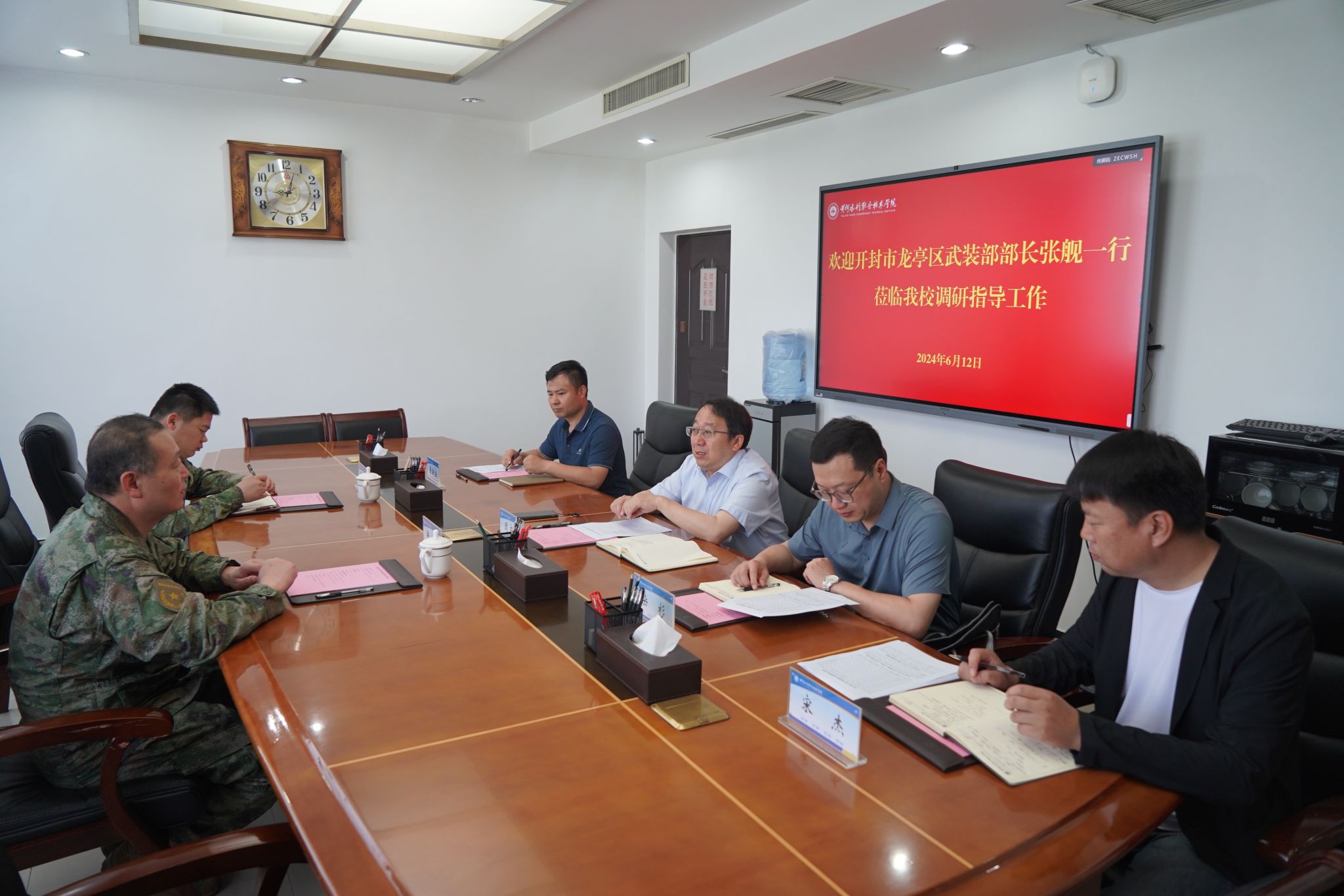 2024年6月12日,开封市龙亭区武装部部长张舰一行,到校进行交流调研,会议在行政楼第三会议室召开,副校长周志琦出席会议。学生工作部(处)、保卫部(保卫处、武装部)等部门负责人参会。