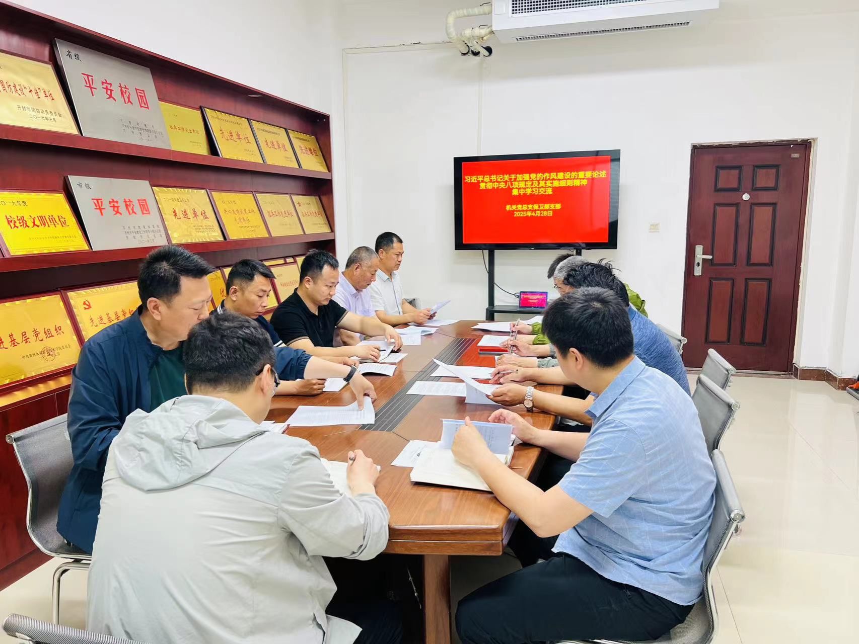 4月28日上午,保卫部党支部在5316党员活动室开展深入贯彻中央八项规定精神学习教育集中学习交流,支部书记柴杉主持会议,全体党员参加。