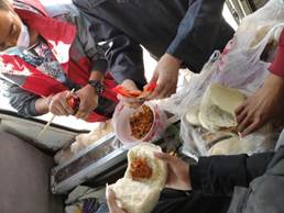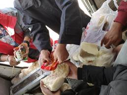 由于我们的工作地点是在沙漠深处,距离住宿地点太远,到了中午,我们就找一块巨大的石头,坐在上面休息一会,然后回到车里,吃点馒头咸菜,喝点白开水,在车上休息半个小时后继续进行工作。下图是我们午餐时拍的照片: