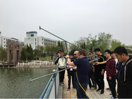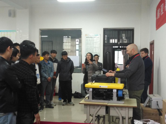 海洋技术项目教学工由理论和实训两部分组成。两位外教巧妙地运用课堂复习、提问、讨论等互动启发式课堂教学方法,用板书和多媒体相结合的方式讲解了水下声学几何原理和几种不同类型声呐的探测原理和使用方法,期间穿插着ROV及扫描声呐安放及操控、系缆绳、图像解译等室外实训教学。在教学之余,师生还通过一些实验探讨了我校光明湖水下地形图和地物立面图绘制的可行性问题。