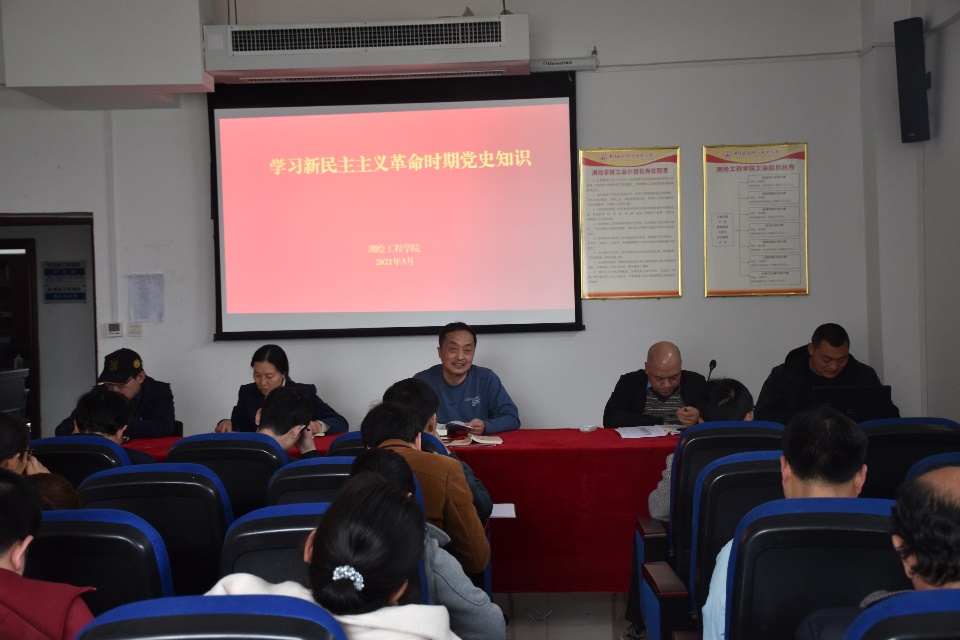 3月30日下午,测绘工程学院党总支书记纪勇在院会议室为全体教师讲授新民主主义革命时期党史知识。党总支副书记彭战松带领全体教师学习研讨《黄河水利职业技术学院2021年全国文明校园创建工作方案》。