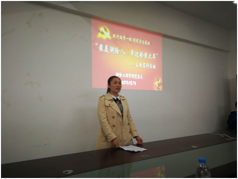 这次由教工支部承办的主题宣讲活动,全院的党员同志参与热情很高,各支部积极推荐身边的感人故事,参赛选手用不同的表现形式、不同的主题,声情并茂地聚焦身边的好人好事、身边的团队、身边的好党员,他们用朴素的语言,激扬的文字,满怀激情地宣传一线教师、一线辅导员等身边普通教师的感人事迹。经过激烈的角逐,基础测量党小组齐建伟宣讲的“党徽在岗位上闪光—记我身边的共产党员朱曙光”荣获第一名并代表测绘学院推荐给学校组织部宣传。