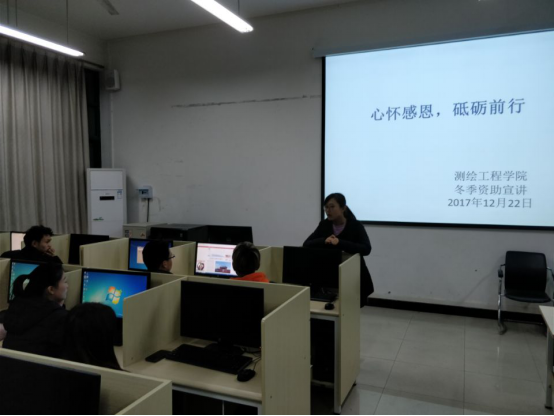 2017年12月22日,测绘工程学院资助专员赵雨琪老师对受到资助的同学进行了“心怀感恩,砥砺前行”的诚信自强主题教育班会。本次班会主题为“诚信、感恩、自强”,旨在帮助学生全面了解资助政策,竖立正确的受助观念,不断提高学生的诚信意识与社会责任感。引导学生讲诚信,懂感恩,会自强,树立我校学生诚信守信,奋发向上的良好形象。