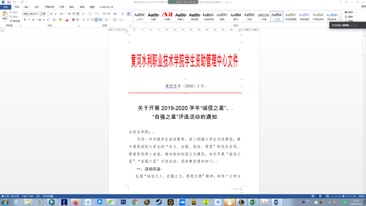 5月12日,测绘工程学院资助专员崔耀辉,通过腾讯会议平台召开了2019-2020学年“诚信之星”、“自强之星”评选动员会。会议围绕黄河水利职业技术学院学生资助管理中心下发的文件进行展开,崔老师对本次的活动宗旨、活动时间、评选对象、评选要求、评选活动方法、步骤和其他相关要求进行了详细讲解。