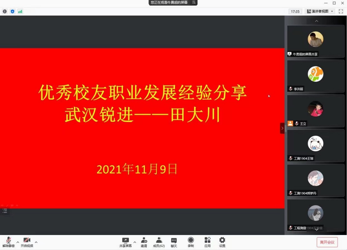 11月9日下午,测绘工程学院邀请优秀校友——武汉锐进铁路发展有限公司总经理田大川为学院2022届毕业生举办职业发展经验分享交流会。