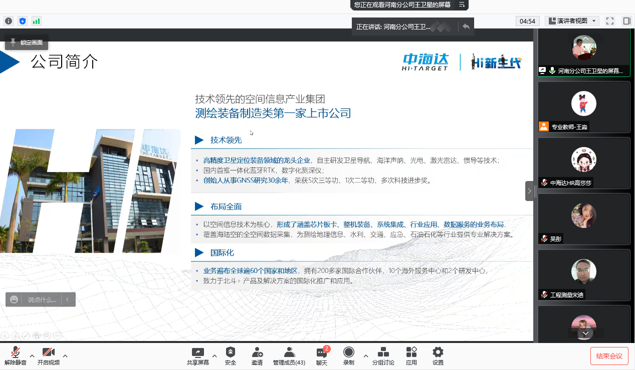 为推进测绘工程学院2023届毕业生就业工作,11月23日晚测绘工程学院邀请广州中海达卫星导航技术股份有限公司开展线上专场招聘会,广州中海达卫星导航技术股份有限公司河南分公司总经理和2023届毕业生参加了本次招聘会。