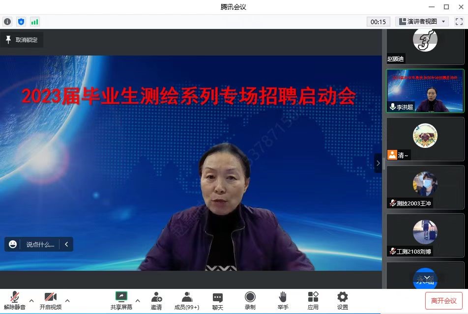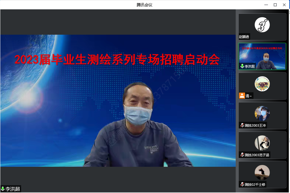 为全面推进2023届毕业生就业工作的开展,帮助毕业生明确就业形势,树立“早就业、就好业、稳就业”理念,测绘工程学院2022年11月22日晚在线上召开了线上2023届毕业生就业推进会——暨测绘专场系列招聘启动会。测绘工程学院党总支书记纪勇,院长陈琳、校企合作办公室主任李洪超、辅导员、班主任及全体2023届毕业生参加了会议。