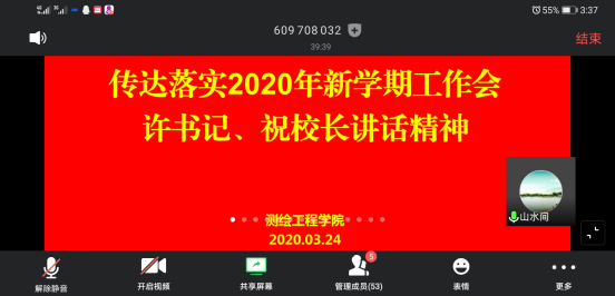 3月24日下午,测绘工程学院召开全体教职工的视频语音会议,会议由院长陈琳主持,院长陈琳领学了3月20日许书记、祝校长在《黄河水利职业技术学院2020年新学期工作会议》上的讲话。