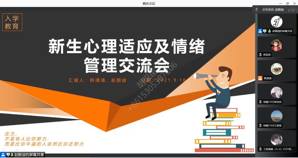9月17日,新生辅导员组织我院2021级全体新生参加心理健康教育讲座,并组织召开了新生心理适应及情绪管理交流会。