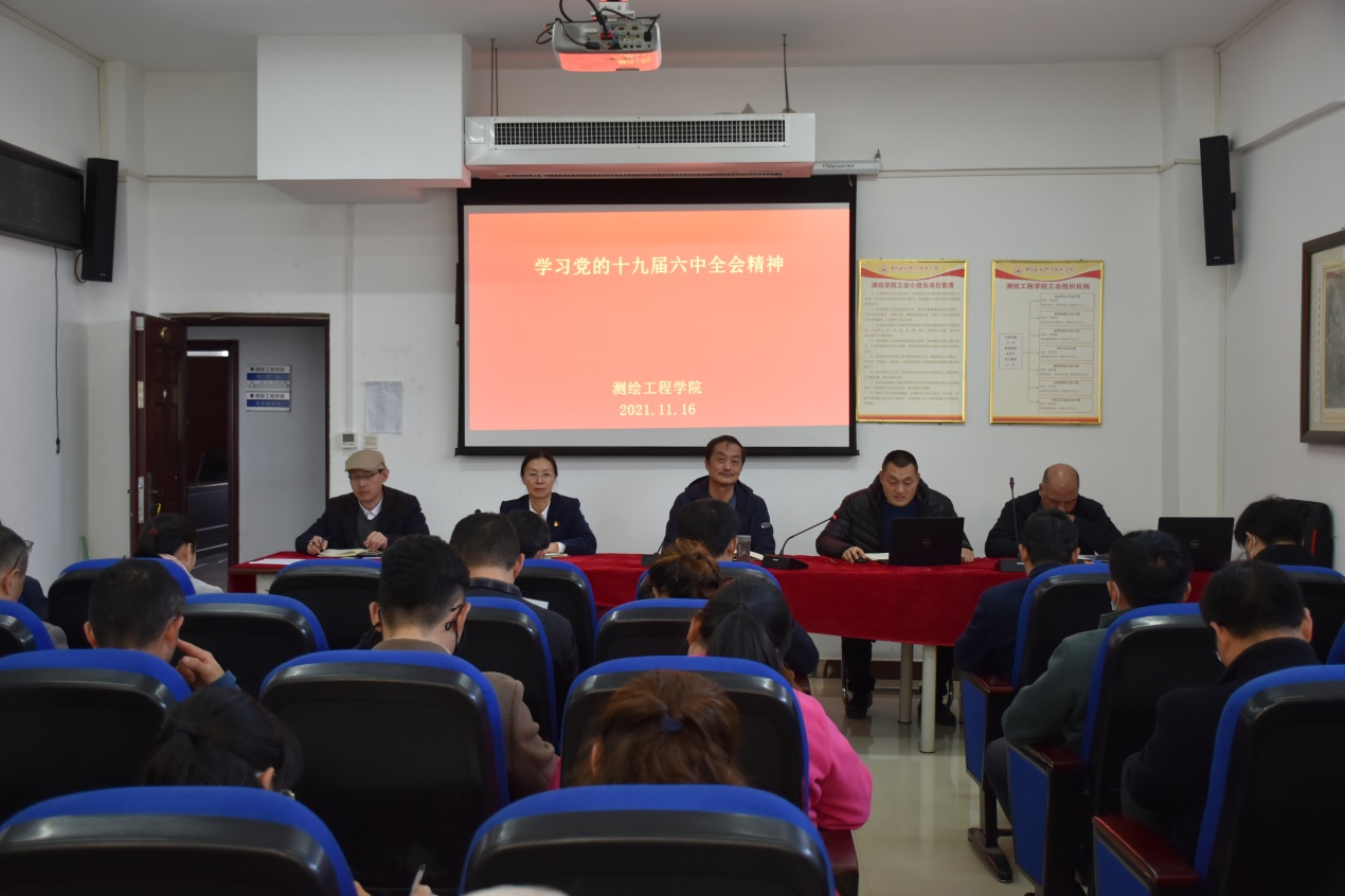 11月16日,测绘工程学院全体教师在院会议室集体学习党的十九届六中全会精神,会议由党总支副书记彭战松主持。