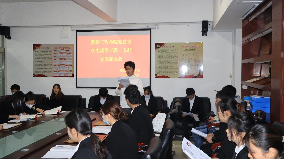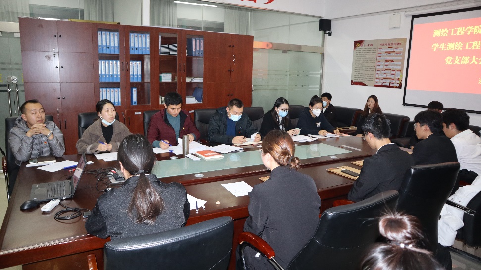 12月3日晚上,测绘工程学院党总支学生测绘工程一支部在党员活动室召开支部大会,讨论张俊飞、郭霖等16名发展对象是否接收为中共预备党员的相关事宜。大会由党支部书记李忠旺主持,本次大会应到正式党员7名,实到正式党员6名,符合党章要求。