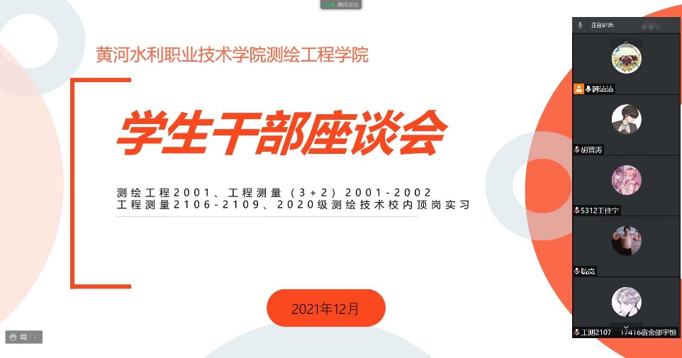 为更好地统筹学生管理工作,12月19日中午,韩清清老师召开线上学生干部座谈会。参加此次会议的有测绘工程2001班、工程测量(3+2)2001-2002班、工程测量2106-2109班等班级委员。