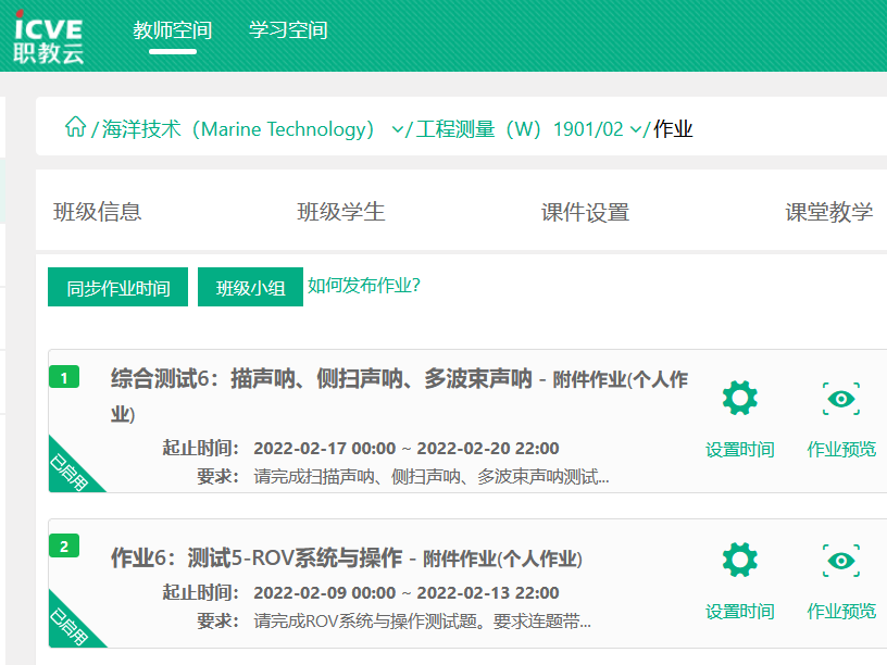 此次授课时间为2022年1月5日—2022年2月18日,每周周二—周五上午8:00-10:00。授课内容分为声学基础、湖沼生物学、多波束声呐、水下机器人ROV、侧扫声呐、扫描声呐等理论知识。网络教学环节主要包括课堂考勤、阶段测试和综合测试四个部分,课堂考勤在直播课堂中完成,阶段测试和综合测试在智慧职教云平台上完成。