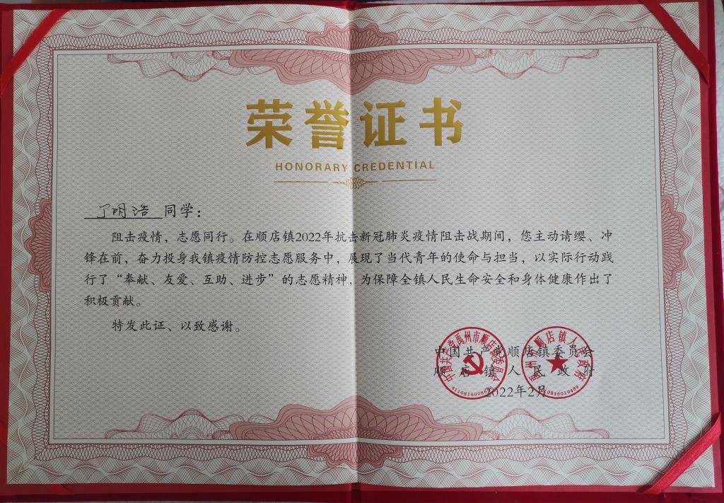 图3 丁明浩获得顺店镇人民政府颁发的荣誉证书