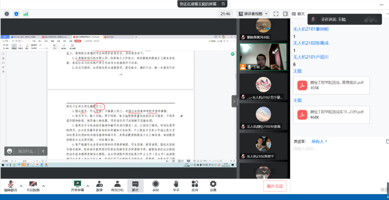 会议采用网络腾讯会议形式召开,由王懿老师讲解顶岗实习手册的内容。王老师从顶岗实习政策解读、实习成绩认定、实习纪律要求和实习安全等几个方面,全面详细地为同学们介绍了涉及顶岗实习工作的方方面面。王老师一方面从国家政策和文件制定的角度,带领同学们认识到顶岗实习的重要地位,另一方面从专业学习的角度,详细地解释了我院顶岗实习工作的具体安排,帮助学生正确认识了实习与专业学习的关系。实习作为一种实践形式,与学校的专业教学密不可分,通过实习能够验证理论的正确性,鼓励同学们在校期间好好学习专业知识和技能,培养踏实严谨积极进取的学习态度。最后,王老师告诫同学们顶岗实习时要注意遵守实习纪律和工作规范,强调了实习安全和注意事项。