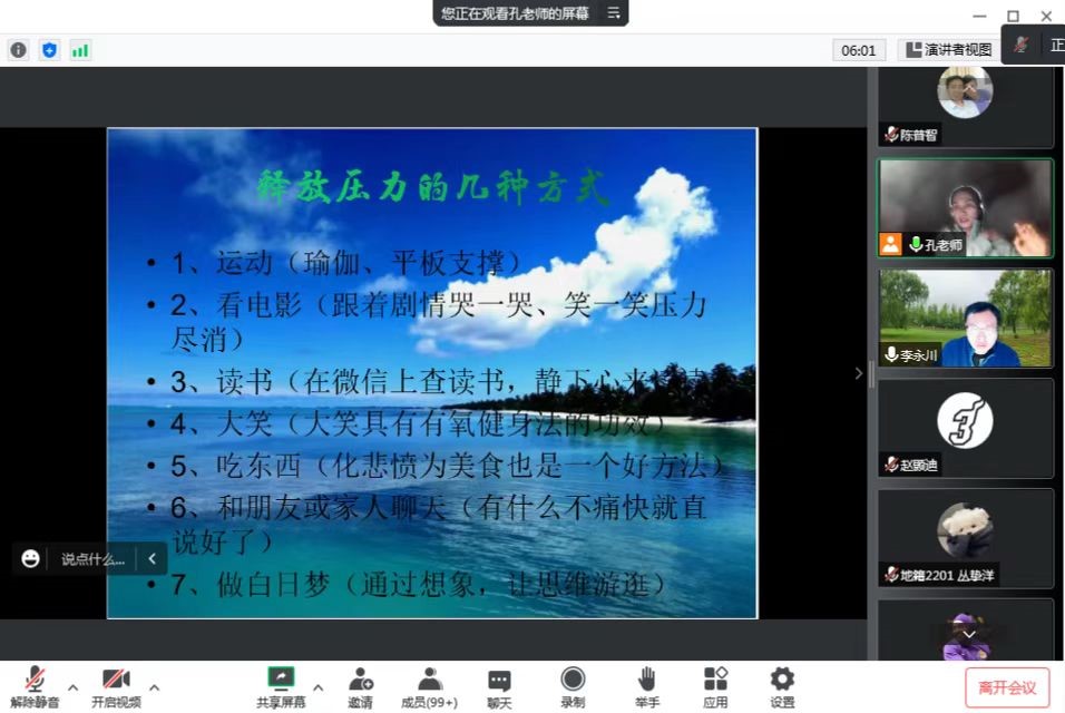 会上,孔令惠老师和同学们畅谈调节情绪、释放压力的方法,她从运动、看电影、微笑、吃东西和朋友家人聊天、做白日梦等方面,告诉同学们在面对长时间密闭环境时,如何做好自我调节,安然度过艰难时节。