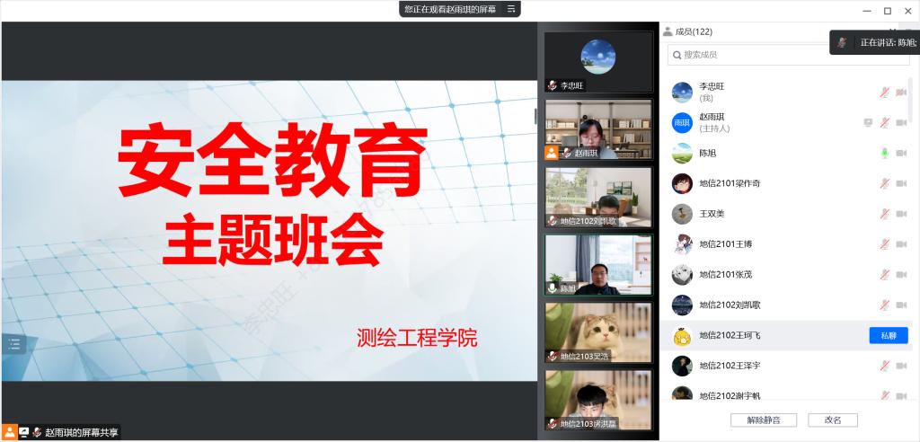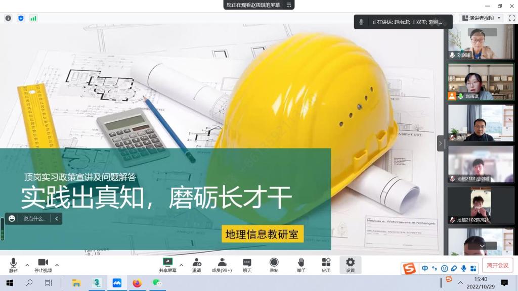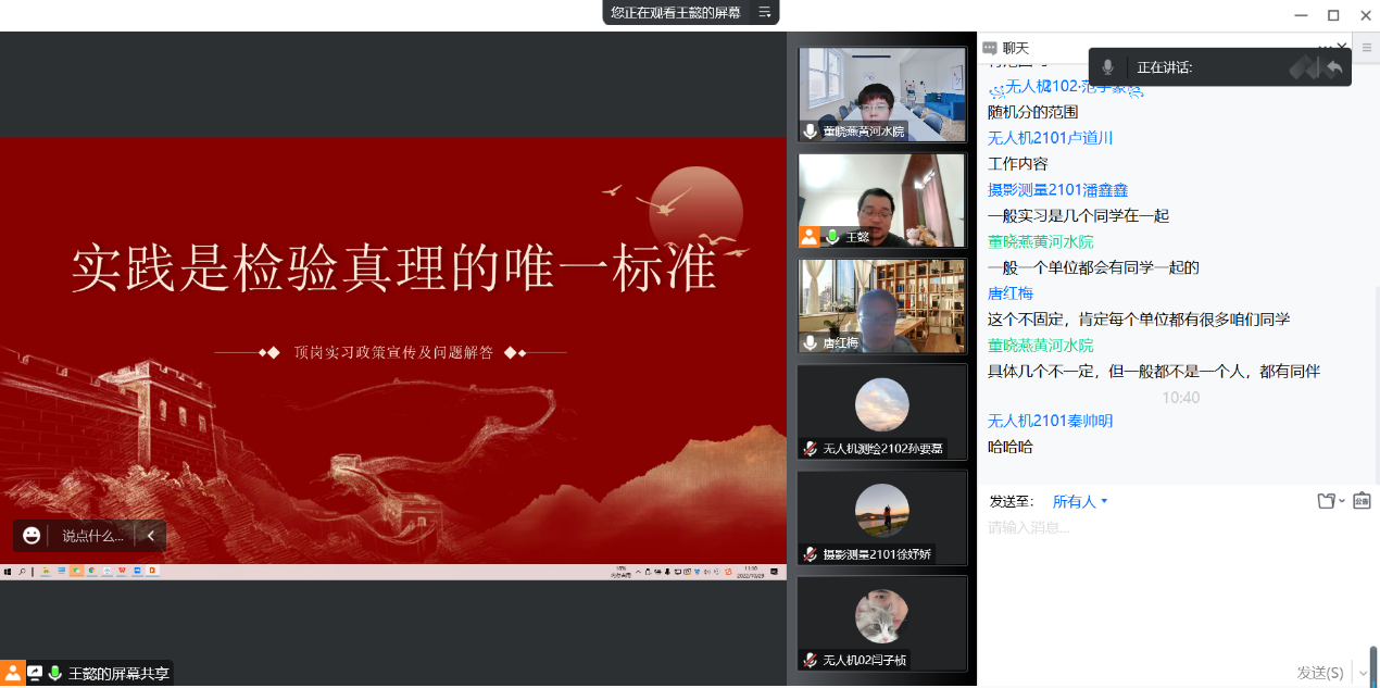10月29日,测绘工程学院测绘地理信息教研室线上开展“实践出真知,磨砺长才干”主题活动,李建辉、王琴、刘剑锋、陈旭、王双美、赵雨琪等老师针对21级地理信息专业学生未来要进行的顶岗实习的政策、注意事项等问题进行专题讲解,并就当前的疫情防控政策,对同学们的心理状况、学习积极性、生活状态进行了良好的沟通与相应的心理辅导。测绘地理信息专业21级全体学生参会。