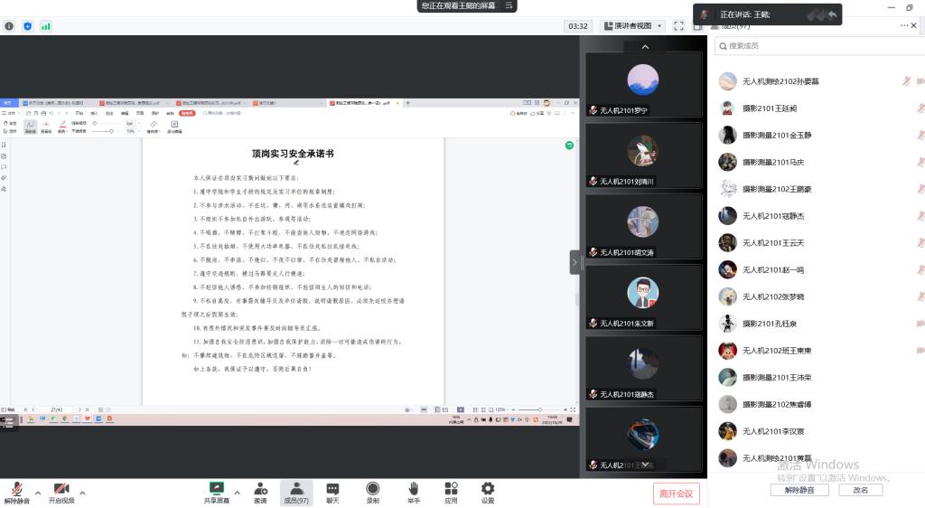 会议采用网络腾讯会议形式召开,由王懿老师讲解顶岗实习手册的内容。王老师从顶岗实习政策解读、实习成绩认定、实习纪律要求和实习安全等几个方面,全面详细地为同学们介绍了涉及顶岗实习工作的方方面面。王老师一方面从国家政策和文件制定的角度,带领同学们认识到顶岗实习的重要地位,另一方面从专业学习的角度,详细地解释了我院顶岗实习工作的具体安排,帮助学生正确认识了实习与专业学习的关系。实习作为一种实践形式,与学校的专业教学密不可分,通过实习能够验证理论的正确性,鼓励同学们在校期间好好学习专业知识和技能,培养踏实严谨积极进取的学习态度。最后,王老师告诫同学们顶岗实习时要注意遵守实习纪律和工作规范,强调了实习安全和注意事项。