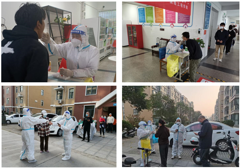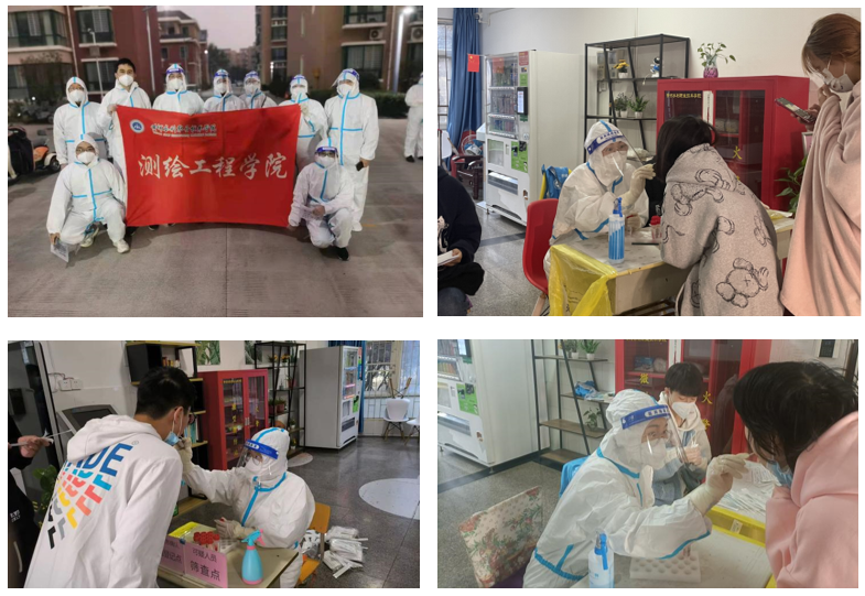 测绘工程学院的教师们更是摇身变成了“大白”志愿者,身着医护人员防护服,在校的给学生做核酸,在家属院的参与教师核酸检测志愿服务和单元楼道消杀,还有师生幕后工作者在微信群中积极传递最新动态、制作宣传语和宣传片。他们通力协作给广大师生提供物质保障和精神力量。