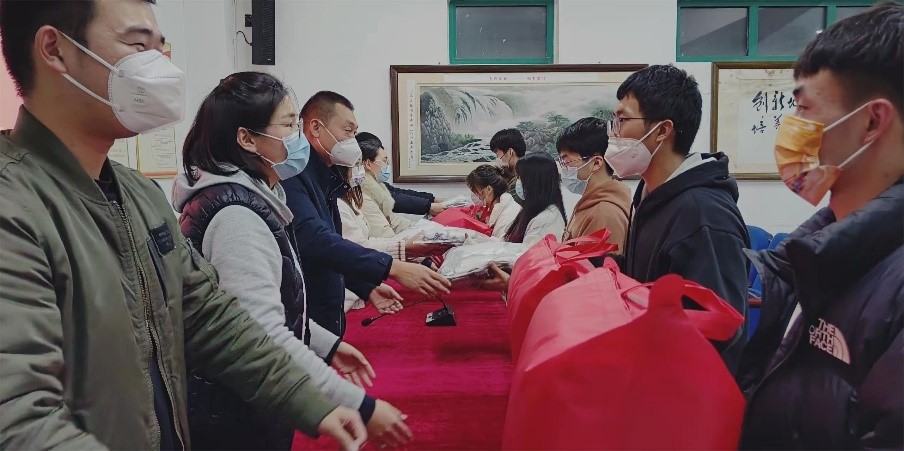 在发放仪式上,彭书记通过讲述自身经历鼓励各位学子保持良好的学习习惯,学好专业知识,以饱满的状态迎接期末考试。接着,各位老师将一套套厚实的棉衣、棉被逐一发给学生,为同学们送上了关怀和温暖,在场学生都备受鼓舞和感动。