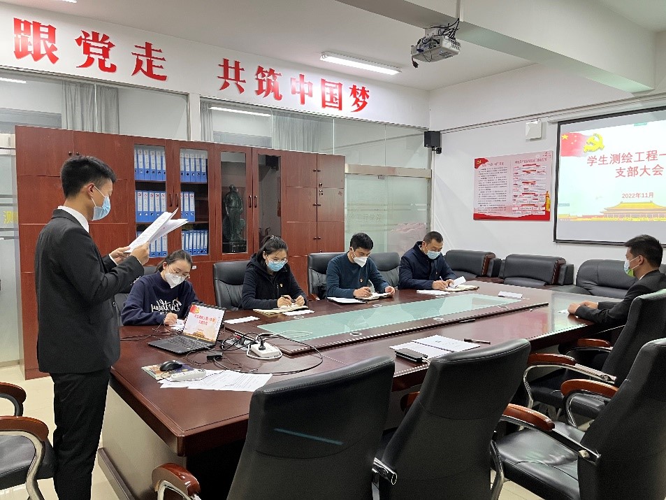 11月29日晚上,测绘工程学院党总支学生测绘工程一支部通过线上线下相结合的方式在党员活动室召开支部大会,讨论聂高峰等6名发展对象是否接收为中共预备党员的相关事宜。大会由党支部书记李忠旺主持,本次大会应到正式党员7名,实到正式党员7名,符合党章要求。