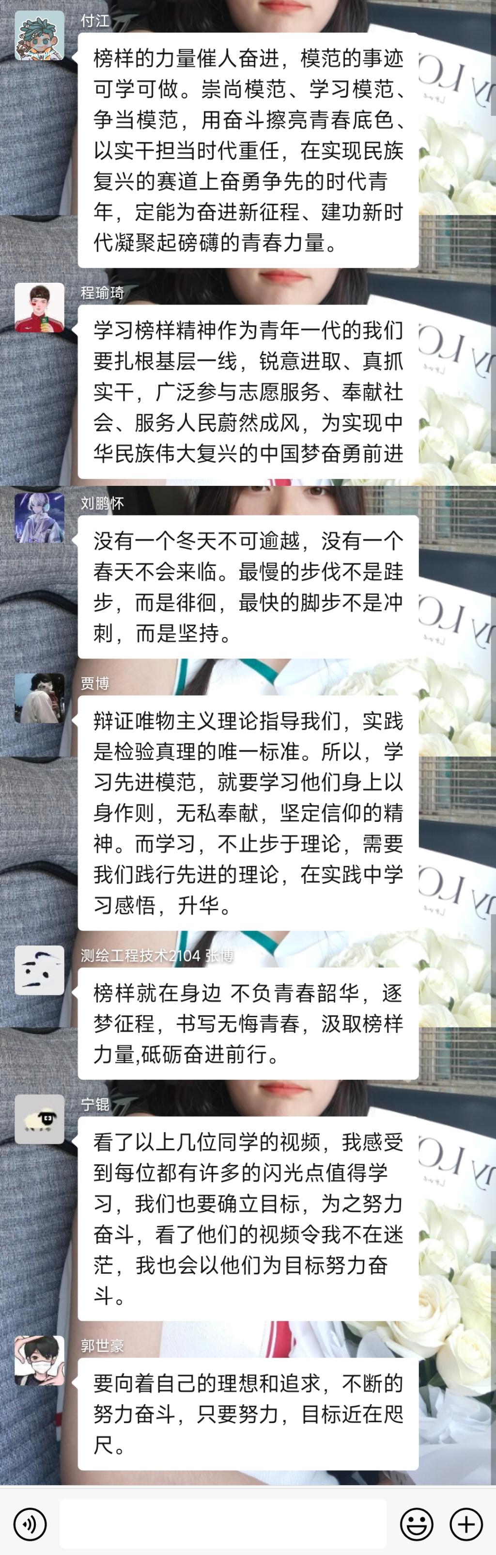 “身边的榜样”优秀大学生事迹宣讲会引起同学们的热烈反响,同学们认真聆听宣讲人的事迹后,在班级群中踊跃分享自己的感悟。纷纷表示,在今后的学习生活中,要以先进典型为榜样,学习榜样精神,汲取奋进力量,争做时代先锋。