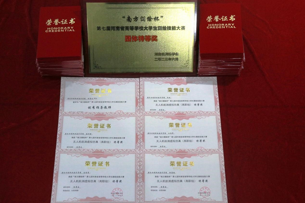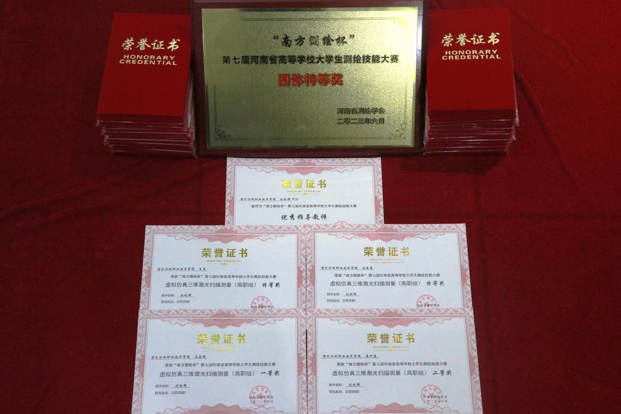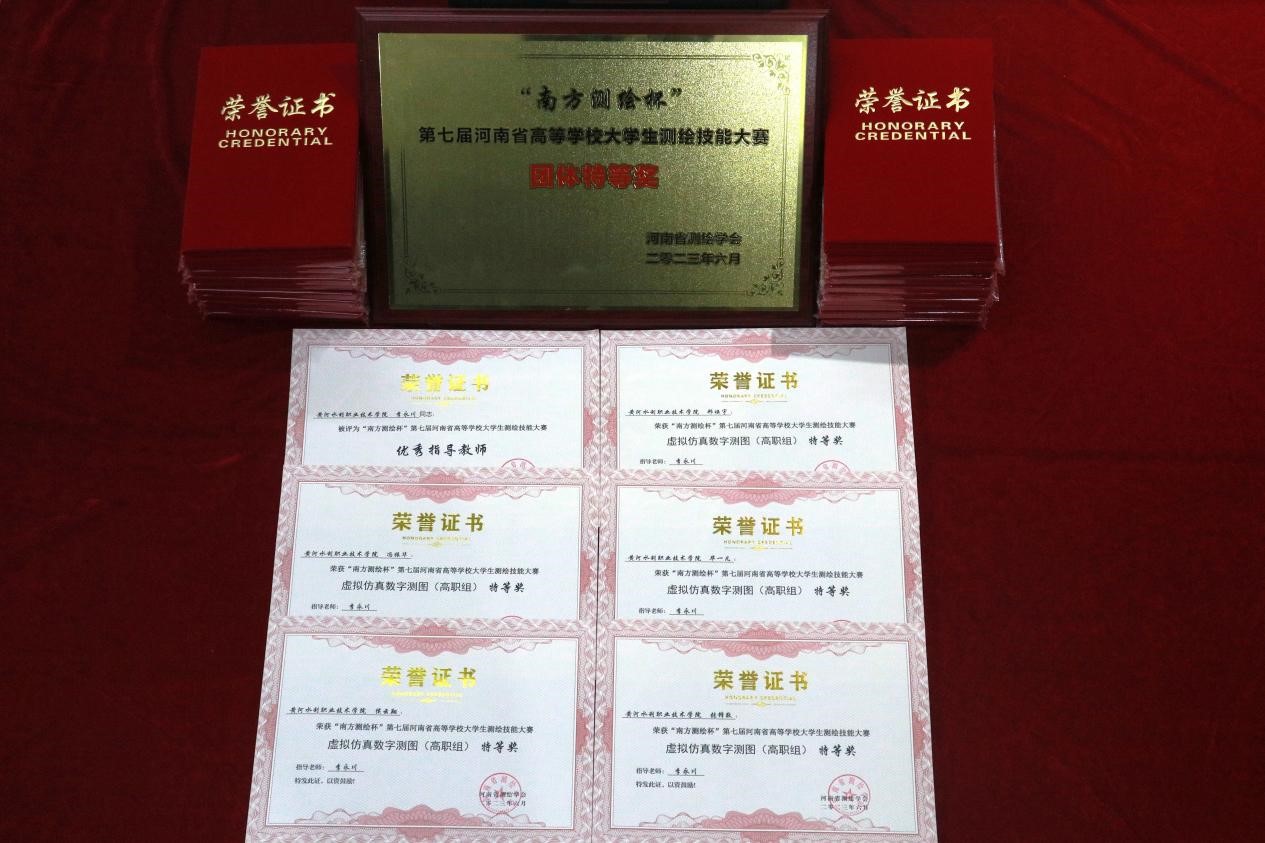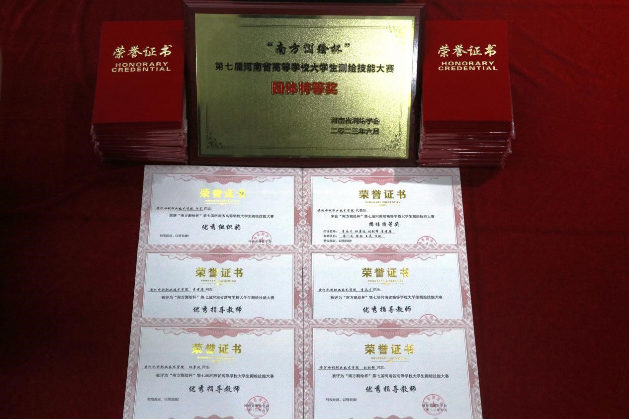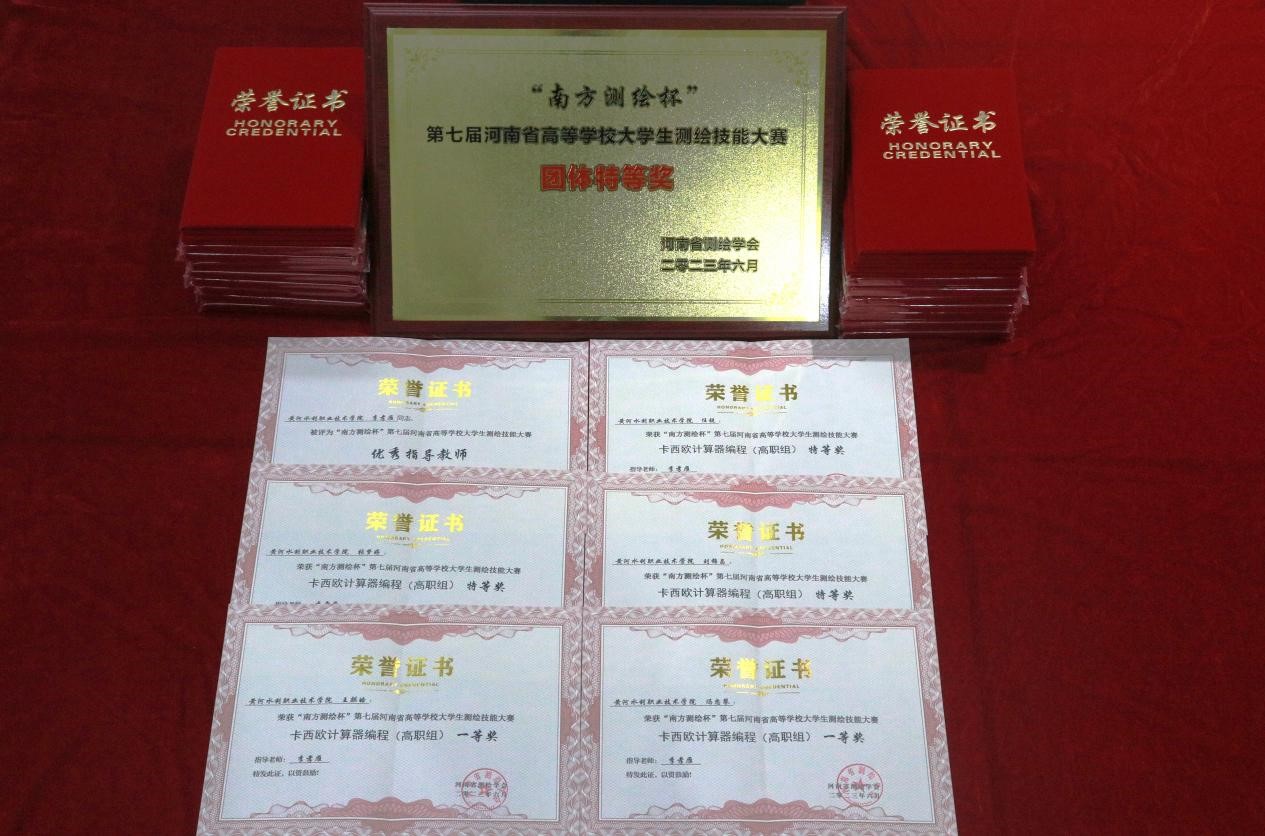 测绘工程学院经过校赛选拔,遴选出20名学生和4名指导老师参加全部赛项,参赛选手沉着应对,最终取得了15个特等奖、3个一等奖和1个二等奖的骄人成绩,并囊括了四个赛项的第一名,李孝雁、李永川、杜勇波、刘剑锋四名指导教师全部荣获优秀指导教师奖,我校代表队荣获团体特等奖,我校获优秀组织奖,是唯一获此奖项的高职院校。