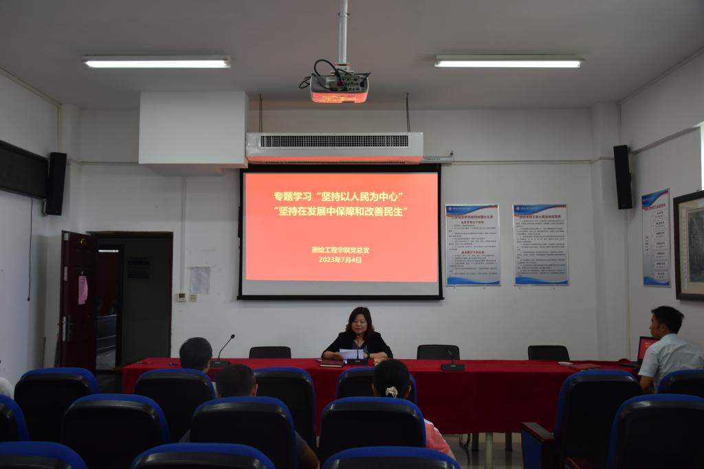 7月4日,测绘工程学院党总支组织全院教师党员在SY5434会议室召开专题理论学习会议,学习内容为“坚持以人民为中心”、“坚持在发展中保障和改善民生”,会议由党总支书记高琼主持。