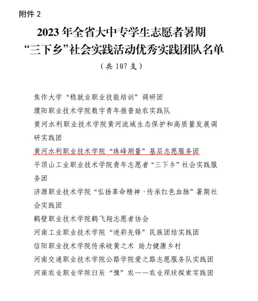 近日,共青团河南省委对在2023年河南省大中专学生志愿者暑期“三下乡”社会实践活动中表现突出的集体与个人进行了通报表扬。测绘工程学院“‘珠峰测量’基层志愿服务团”表现优异,荣获2023年全省大中专学生志愿者暑期“三下乡”社会实践活动优秀实践团队。