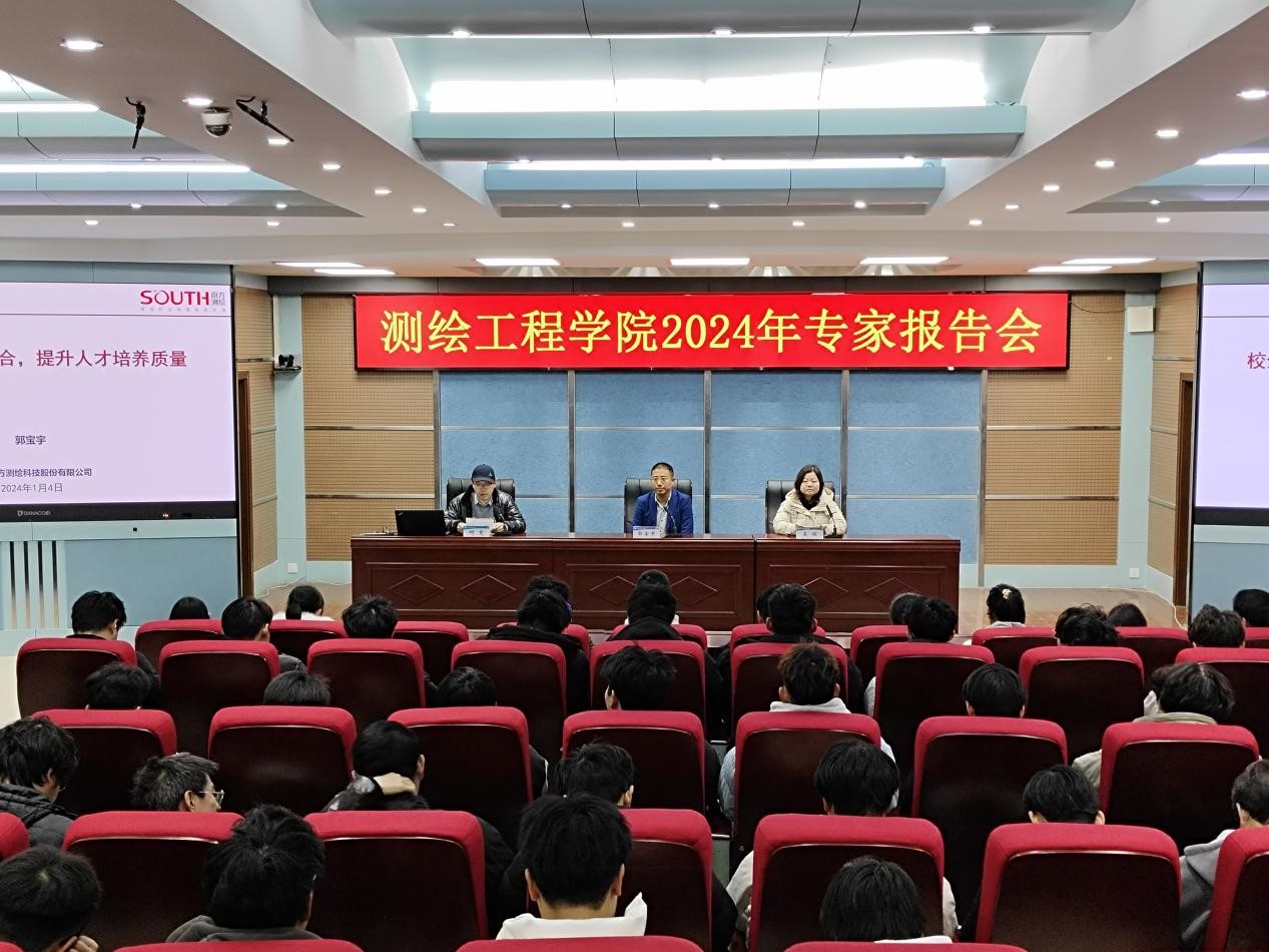 2024年1月4日下午,测绘工程学院特邀广州南方测绘科技股份有限公司副总裁郭宝宇在我校3号实训楼学术报告厅举办校企协同产教融合专题报告会。测绘工程学院党总支书记高琼、院长何宽、测绘地理信息技术专业群带头人陈琳,及我院部分教师和学生共150余人参加报告会。报告会由何宽教授主持。