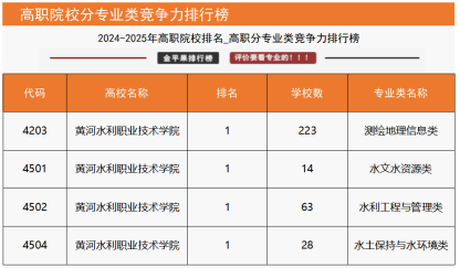 “国家级高水平专业群综合竞争力评价”数据显示,我校水利水电建筑工程专业群、测绘地理信息专业群2个高水平专业群上榜入围,在同类专业群中位列全国第一;“高职院校分专业大类竞争力排行榜”数据显示,我校资源环境与安全大类、水利大类2个分专业大类均位列全国第一;“高职院校分专业类竞争力排行榜”数据显示,我校测绘地理信息类、水文水资源类、水利工程与管理类、水土保持与水环境类4个专业类均位列全国第一;“高职院校专业竞争力排行榜”数据显示,我校14个专业上榜,其中测绘地理信息技术、摄影测量与遥感技术、地籍测绘与土地管理、无人机测绘技术、水文与水资源技术、水利工程、智慧水利技术、水利水电工程技术、水利水电建筑工程、水土保持技术、水电站设备安装与管理、治河与航道工程技术12个专业位列全国第一,测绘工程技术、水生态修复技术2个专业位列全国第二,土木工程检测技术、环境检测技术2个专业位列全国第三。