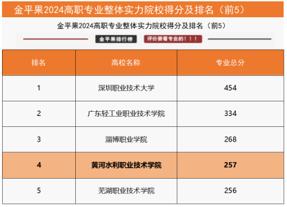 5月16日,“金平果”第四次发布高职专业群综合竞争力评价数据,第五次发布高职专业排行榜。我校在“金平果”排行榜中2个专业群、2个专业大类、4个专业类、12个专业均列全国第一。在“高职专业整体实力院校”方面,我校位列全国第四。