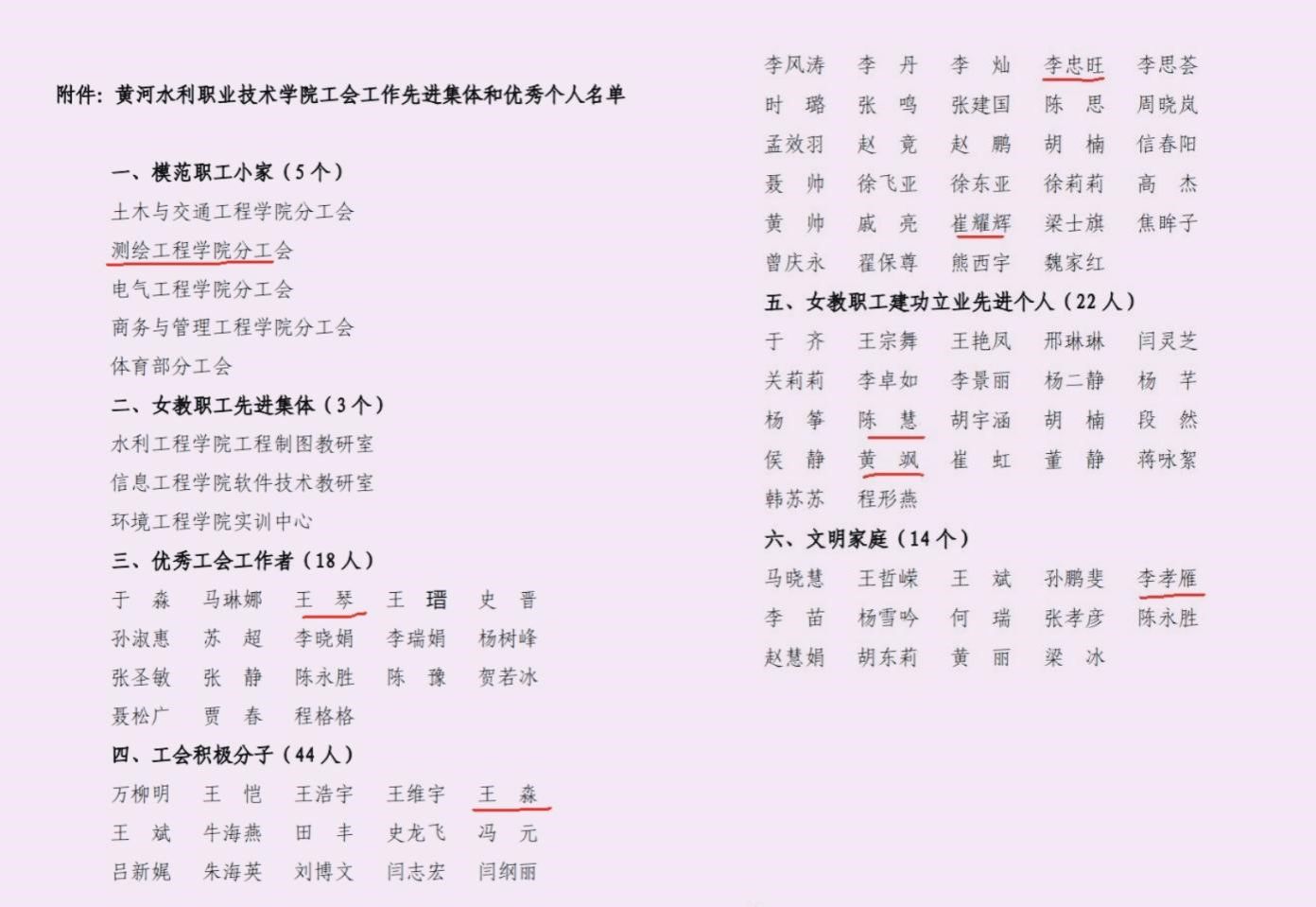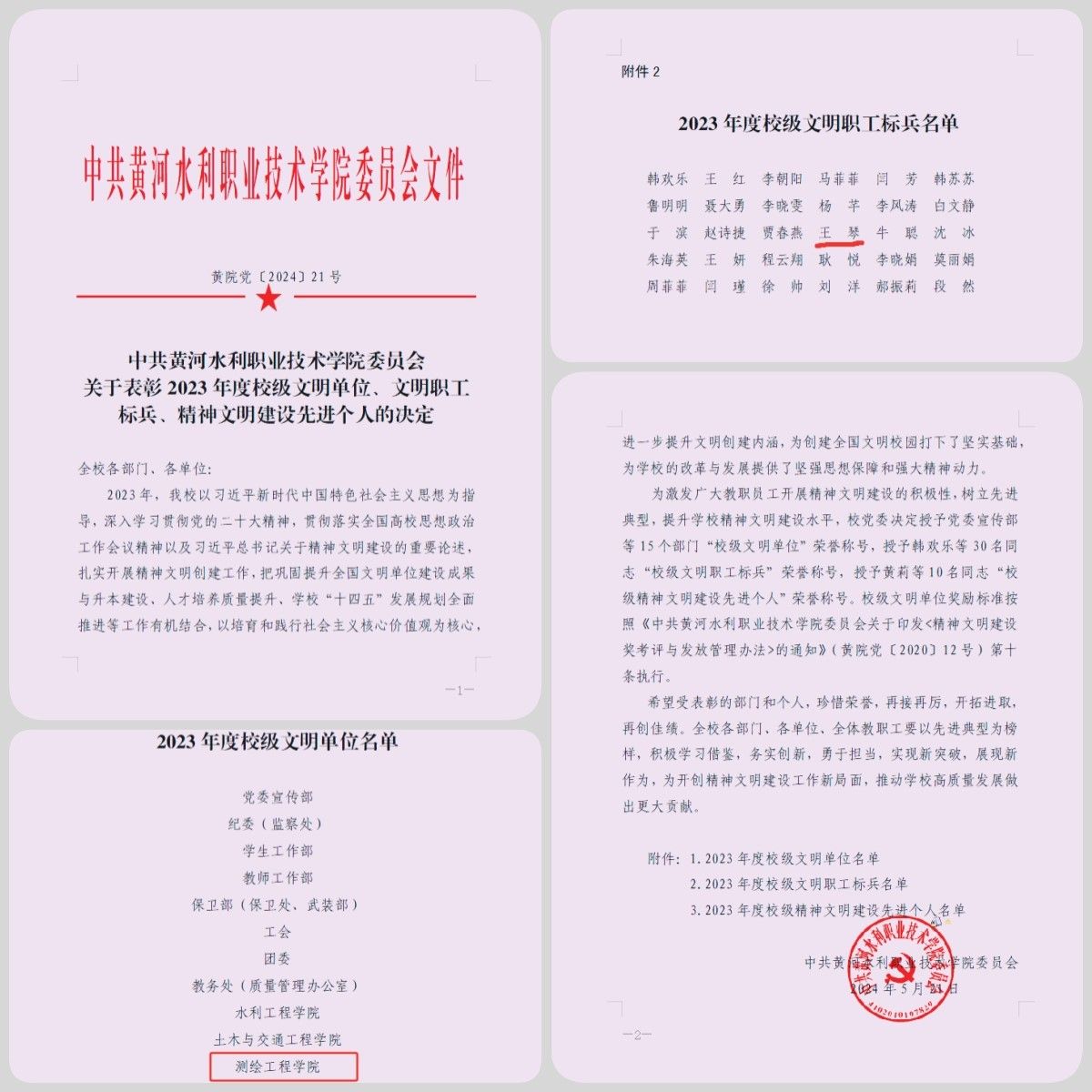 测绘工程学院始终认真贯彻落实校党委和校工会的工作部署要求,务实创新,勇于担当,获评2023年度“校级文明单位”和“模范职工小家”,11名教职工分别获评“文明职工标兵”“优秀工会工作者”“工会积极分子”“女教职工建功立业先进个人”“文明家庭”等荣誉,获奖教职工占全院教职工人数的18%。