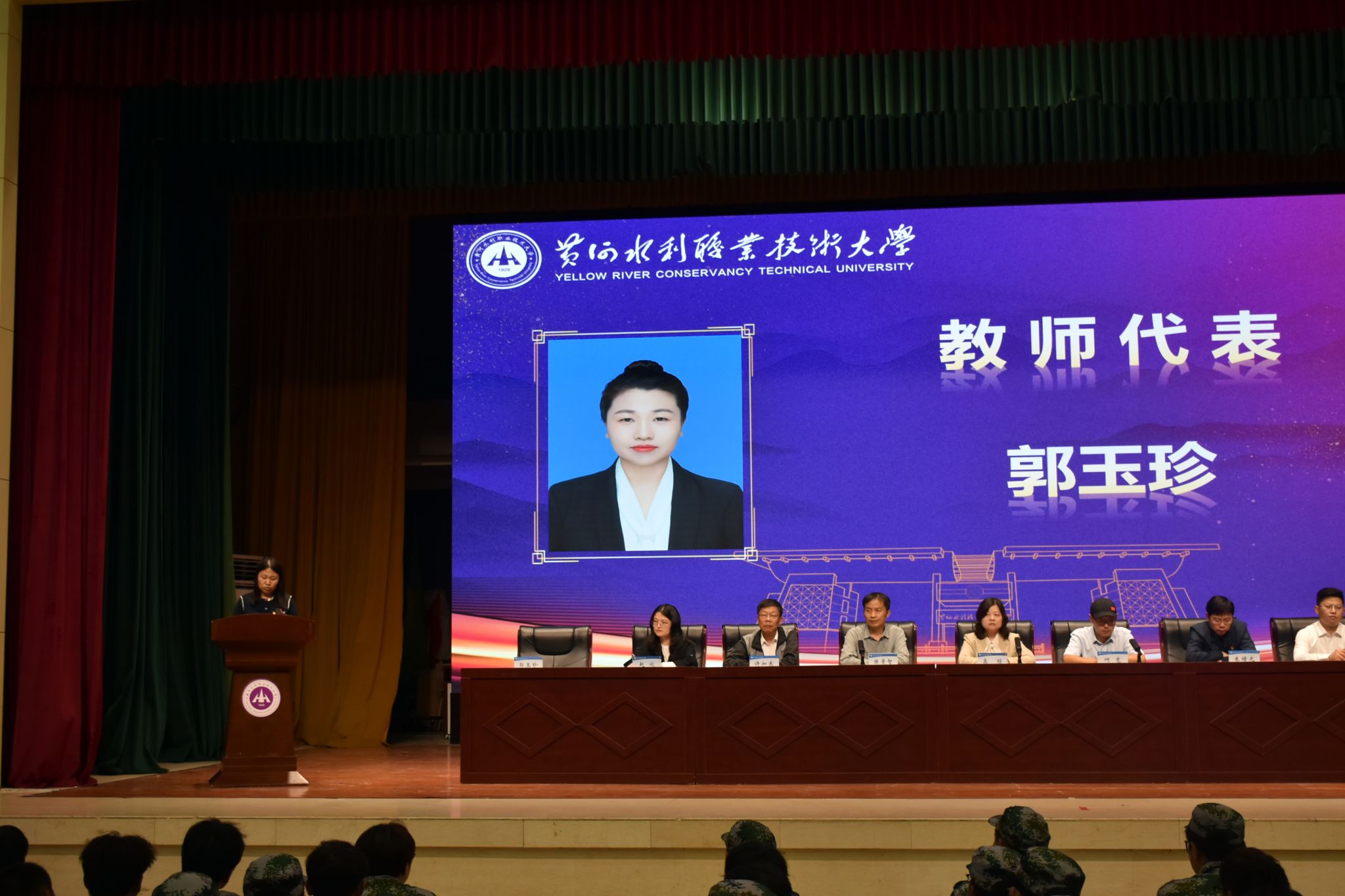 优秀教师代表郭玉珍发言,嘱咐同学们在校期间需扎实掌握测绘仪器使用、数据处理等专业核心技能,积极参与各类技能竞赛,以赛促教培养不怕吃苦、团结协作的测绘人精神,不断拓宽视野、磨练意志品质,努力成长为行业所需的高质量专业技能人才。