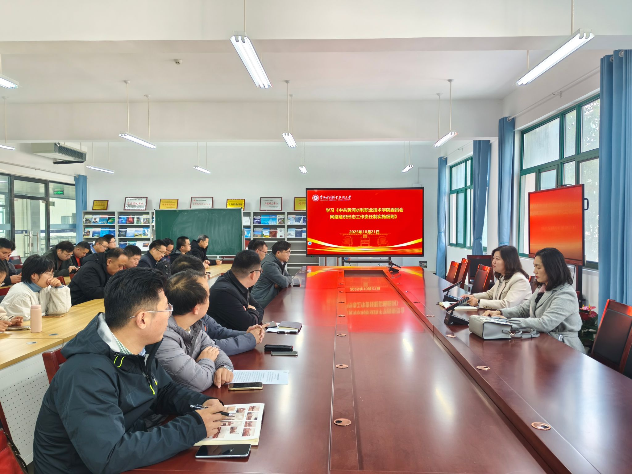 10月21日,测绘工程学院在SY6307开展2025年下半年第四次政治理论学习专题会。党总支书记高琼领学《中共黄河水利职业技术学院委员会意识形态工作责任制实施细则》和《中共黄河水利职业技术学院委员会网络意识形态工作责任制实施细则》。