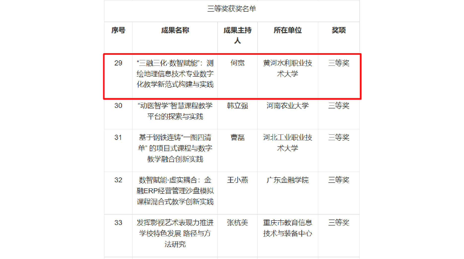 近日,中国教育技术协会正式公布中国教育技术协会“数字教育创新成果奖”获奖结果,我校申报的《“三融三化·数智赋能”:测绘地理信息技术专业数字化教学新范式构建与实践》获得三等奖。