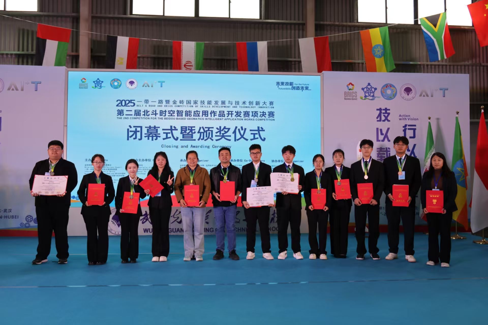 11月19日至11月23日,2025“一带一路”暨金砖国家技能发展与技术创新大赛之第二届北斗时空智能应用作品开发赛项决赛赛项在湖北武汉举行,来自全国70多支参赛队同台竞技。黄河水利职业技术大学选派测绘工程学院杨健、孙瑞2名教师及韩玉烽、钟静仪、王艺璇、刘旭康、丁晨朔、付启呈、代书源、李亚珊、郭昕瑶、樊紫晗10名学生共5支队伍分别参加了教师组和学生组比赛,经过奋勇拼搏,教师组斩获1金1铜,学生组斩获1金、2银、2铜的优异成绩,学校获得“最佳组织奖”和2个赛项的“优秀组织奖”,郭玉珍、何宽两位老师获优秀指导老师奖。