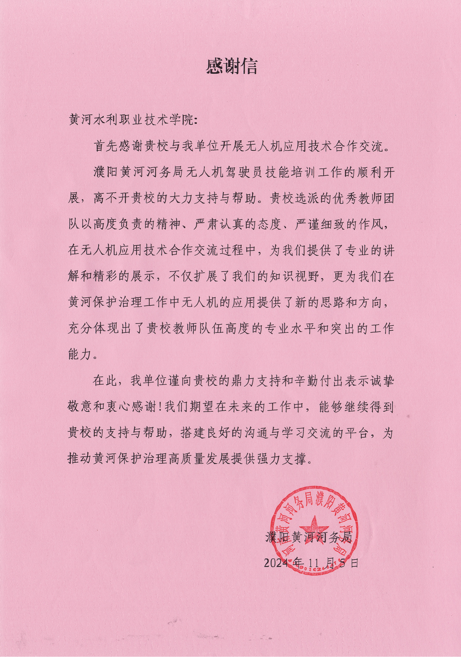 感谢信中提到,濮阳黄河河务局无人机驾驶员技能培训工作的顺利进行,得益于黄河水利职业技术学院的大力支持与帮助。学校选派的由四名师生组成的优秀团队展现出了高度的专业水平和突出的工作能力,为濮阳黄河河务局的无人机应用技术发展提供了宝贵的支持和帮助。濮阳黄河河务局对此表示诚挚的感谢,并期待在未来的工作中能够继续得到学校的支持与帮助,共同搭建良好的沟通与学习交流平台,为推动黄河保护治理高质量发展提供强有力的技术支撑。