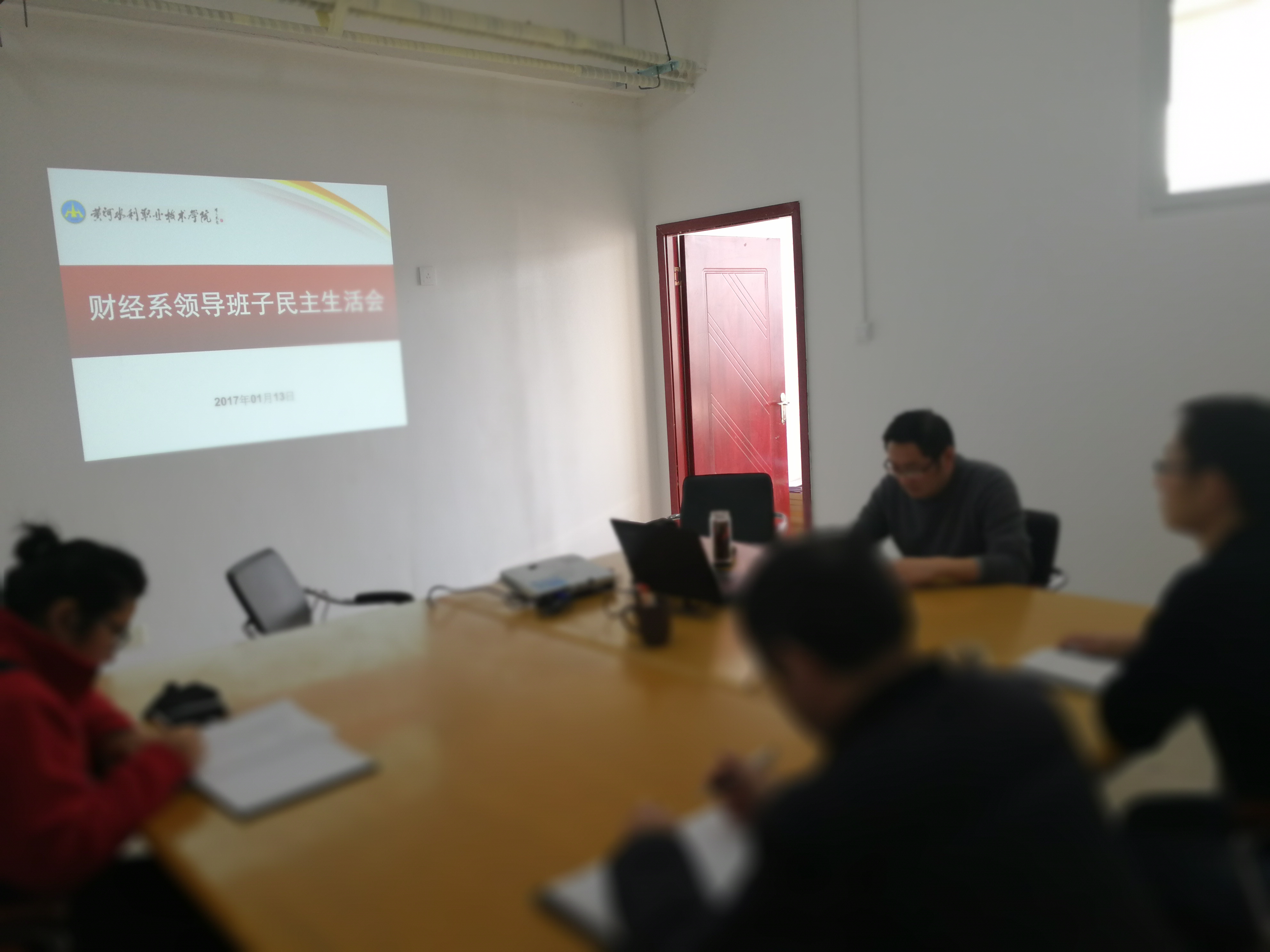 113日上午,财经系在5号实训楼5416会议室召开了系领导班子民主生活会,会议由财经系党总支书记杜广平主持,系主任宋建涛、副主任吴宗奎、副书记胡晓慧参加会议。