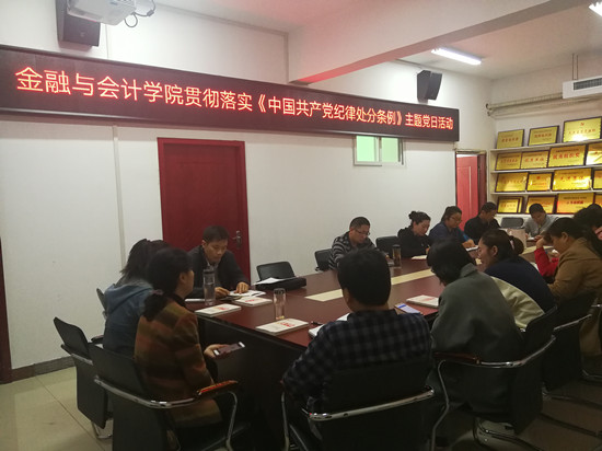 2018年10月30日下午3时,金融与会计学院教工党支部在党员活动室开展贯彻落实《中国共产党纪律处分条例》主题党日活动,活动由教工党支部书记苏永彪主持,金融与会计学院全体教工党员参加。