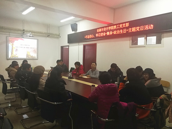 2018年12月25日下午,金融与会计学院教工党支部在院党员会议室开展“不忘初心、牢记使命”集体“政治生日”主题党日活动。活动由教工党支部苏永彪书记主持,全体教师党员参加。
