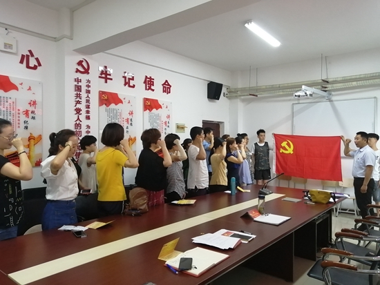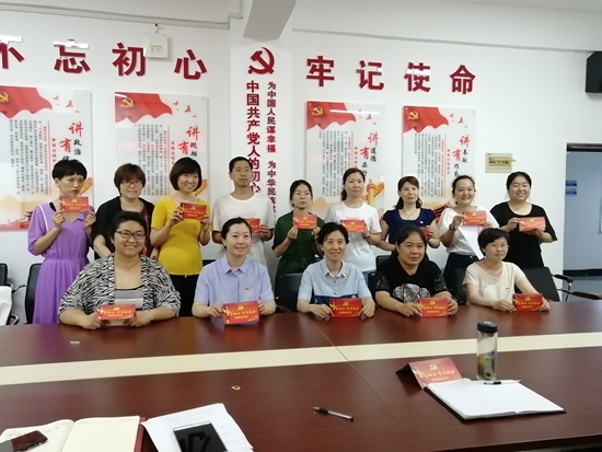党总支书记殷莺、院长宋建涛、副书记胡晓慧为19名同志分别赠送了“政治生日”贺卡。全体党员一同观看“不忘初心、牢记使命”学习视频并交流学习体会。组织委员杨阳同志带领全体党员面对党旗,重温入党誓词。