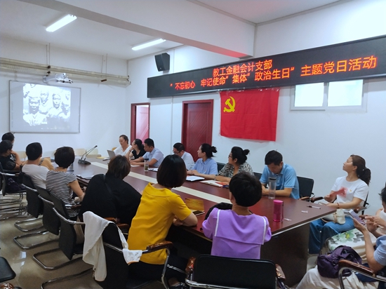 2019年6月25日下午,教工金融会计党支部在SY5412党员会议室举行了“不忘初心、牢记使命”集体“政治生日”主题党日活动,全体教工党员参加。活动由支部书记郝瑶主持。